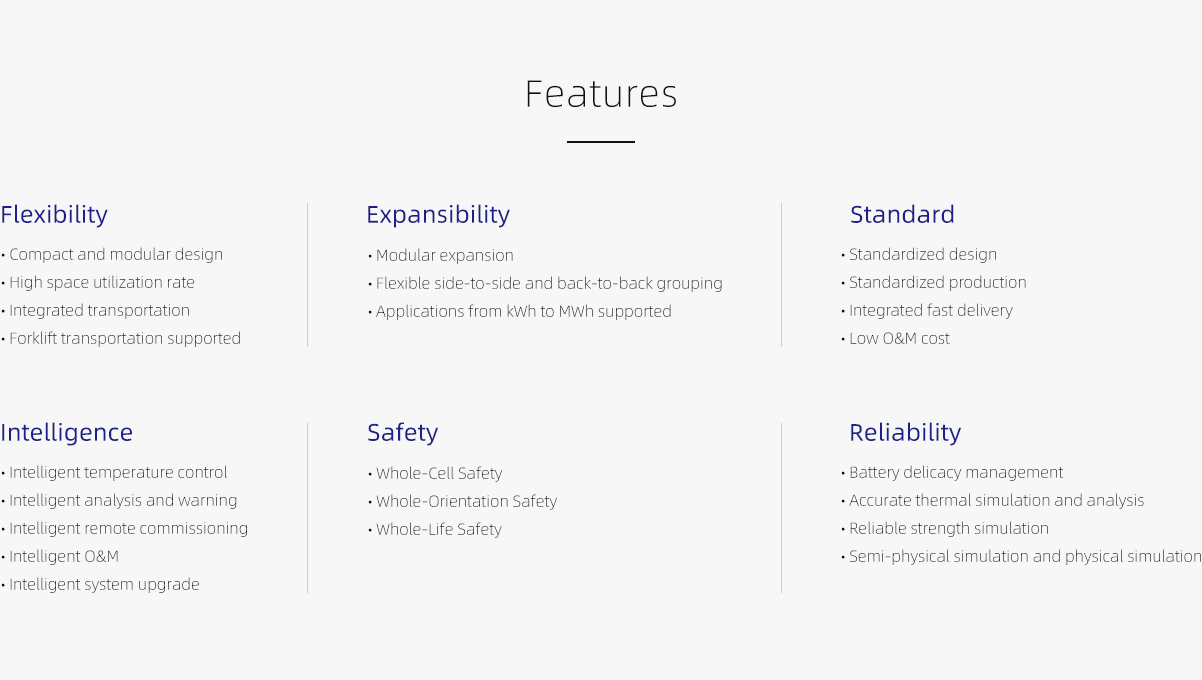 This product, as a representative of highly modularized and standardized SVOLT products, is designed according to the 3S concept and the automotive grade quality requirements. It features peak shaving, new energy cogeneration, dynamic capacity expansion, demand management, power quality management, distributed power generation, emergency power standby and other functions, and can effectively support the rapid charging demand of electric vehicles.