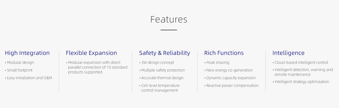 This product, integrating battery, BMS, PCS, EMS, air conditioning and fire prevention system, is applicable to substations, small industrial and comm-ercial buildings, hospitals, charging stations and families, and features peak shaving, new energy co-generation, dynamic capacity expansion, demand management, power quality management, emergency power standby and other functions.
