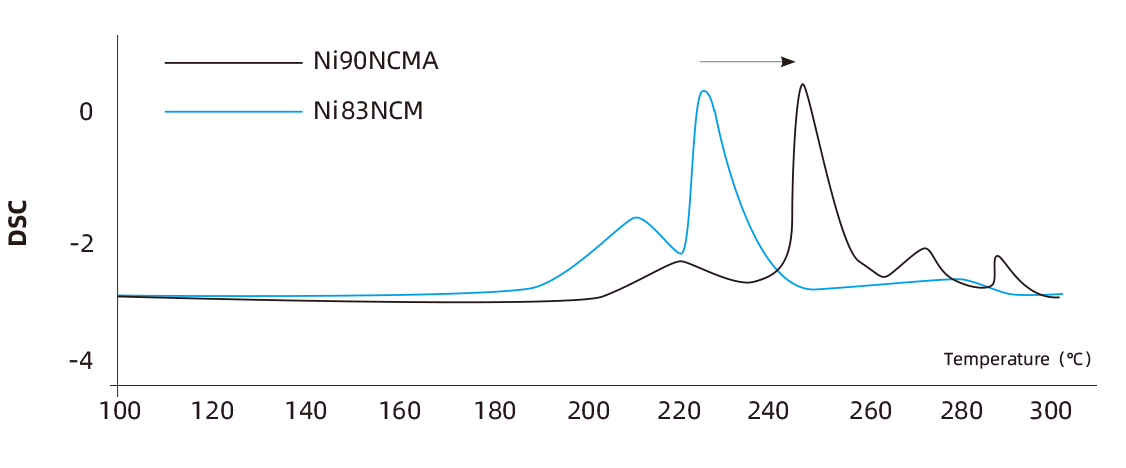 NCMA cathode material of SVOLT can withstand 20℃ higher than NCM811 material in terms of DSC thermal stability, and can reach 50 cycles without capacity fading (99.5%)